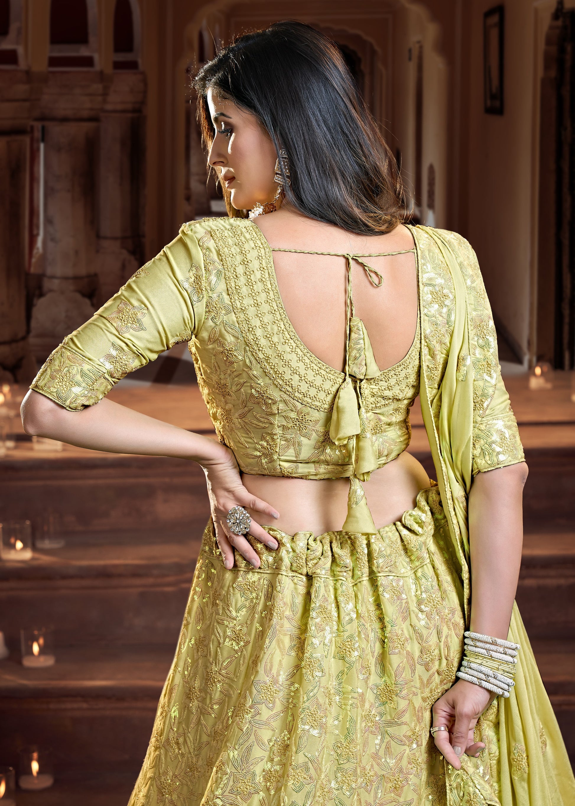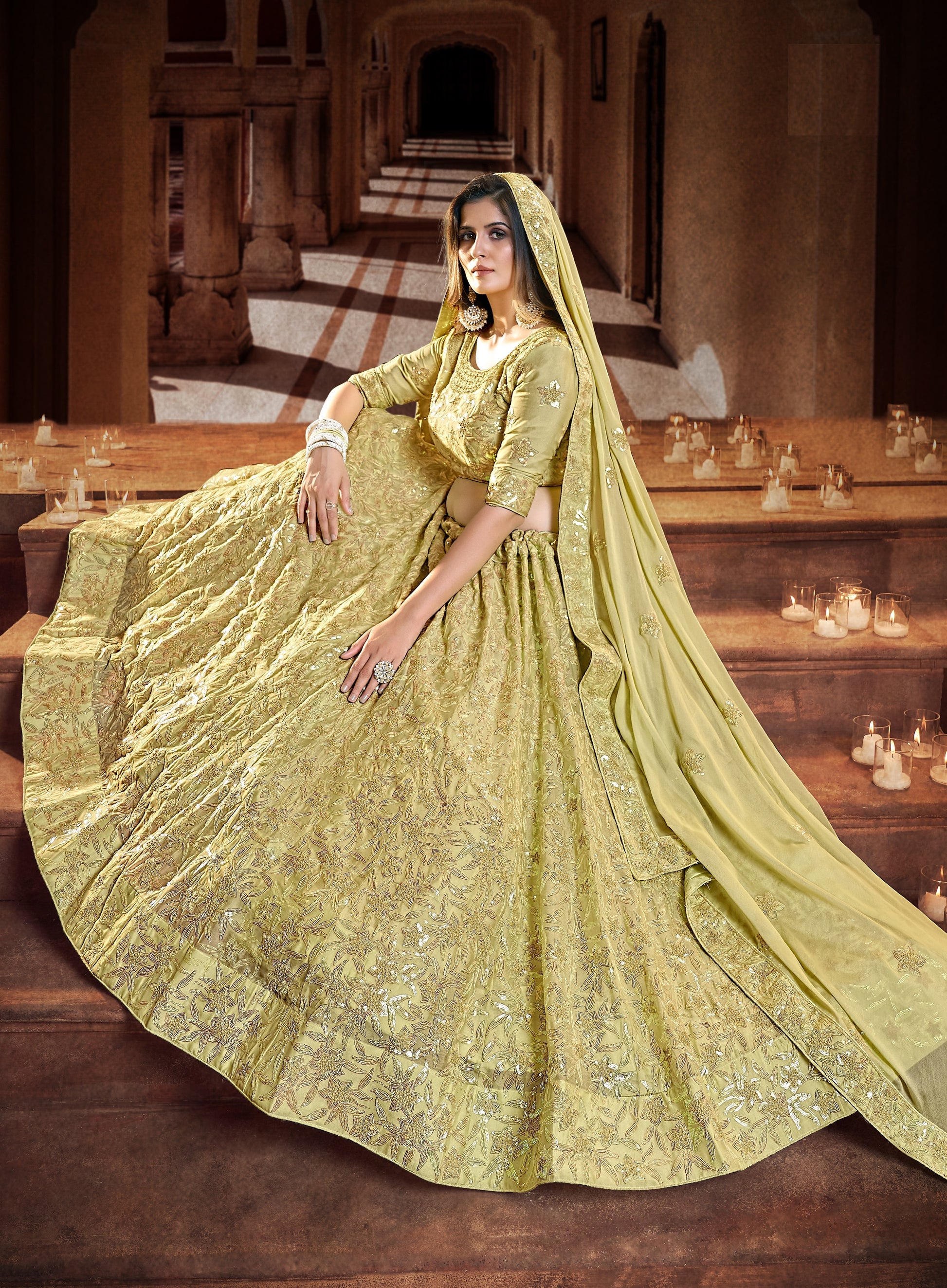 Yellow & Golden Embroidered lehenga choli with dupatta, has sequinned. Yellow & Golden Embroidered blouse, Yellow & Golden Embroidered lehenga, flared hem, attached lining. Yellow & Golden Embroidered Net dupatta, has taping border with sequinned work.