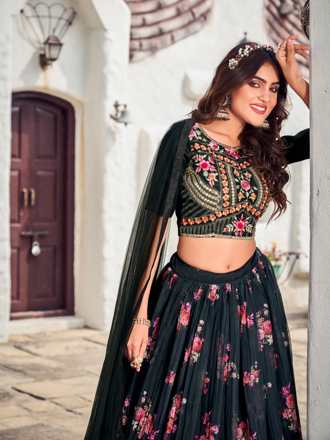 • Black printed unstitched blouse, has a round neck, sleeveless, Brown printed semi-stitched lehenga, has drawstring closure, flared hem