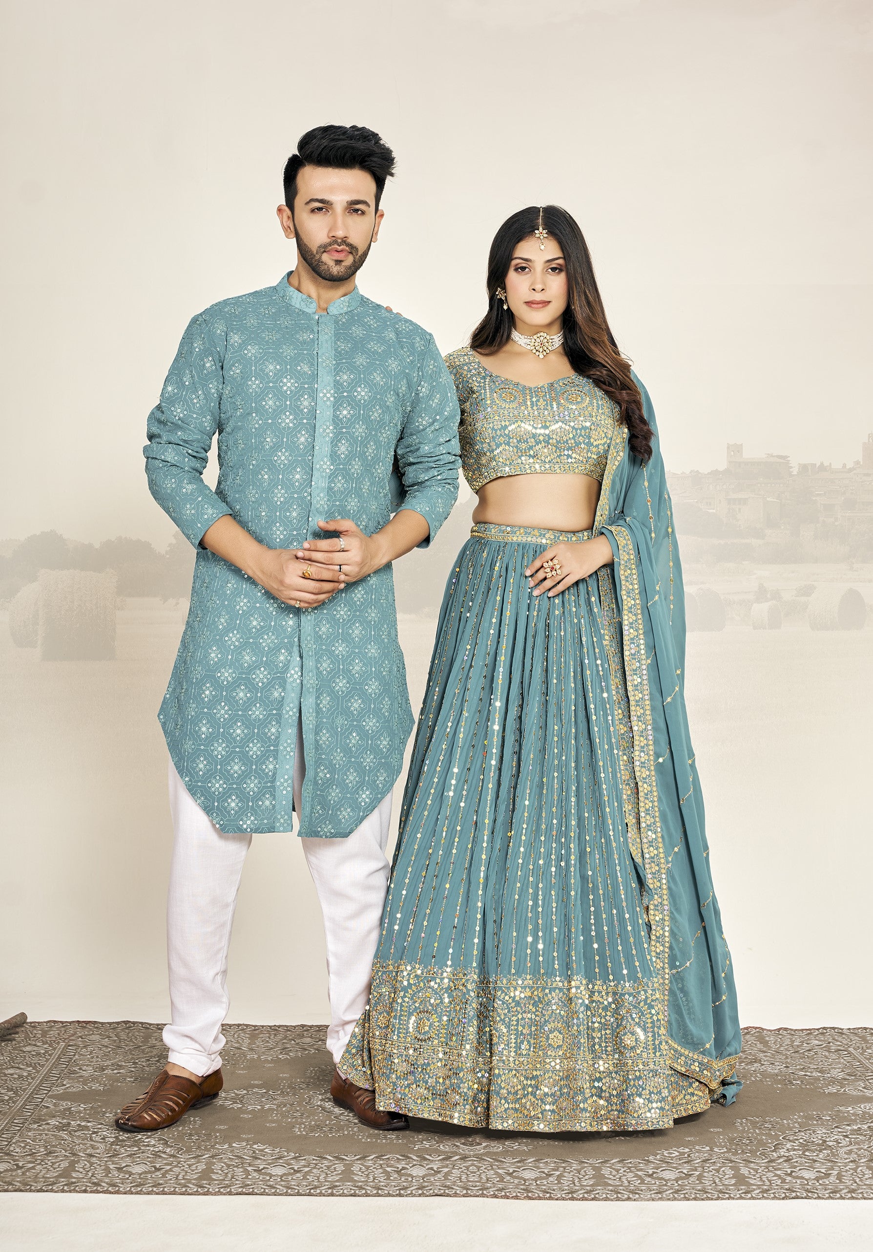 Lehenga:The woman’s outfit consists of a light blue lehenga. A lehenga is a skirt with a flared silhouette, often worn for special occasions. Hers features golden embroidery, adding elegance.