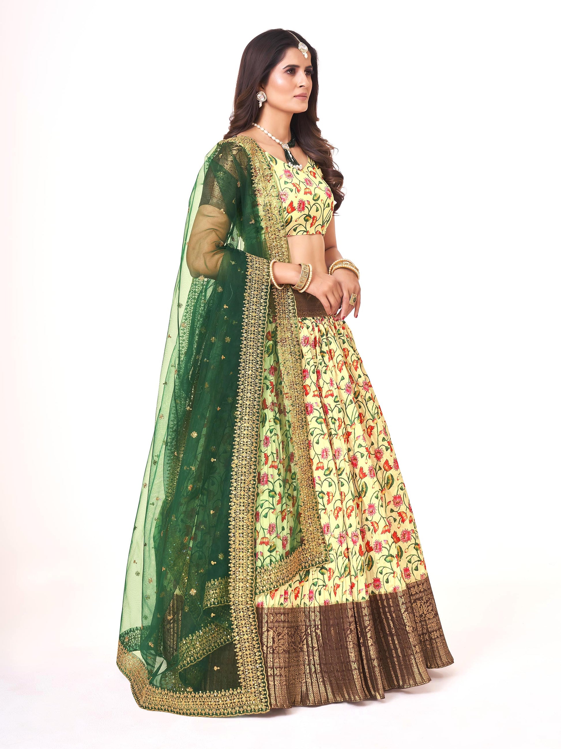 This banarasi lehenga comes with yellow color floral printed lichi banarasi silk blouse and a green color soft net fabric dupatta (2.5 meters) created with sequence and zari embroidered work on lace border.