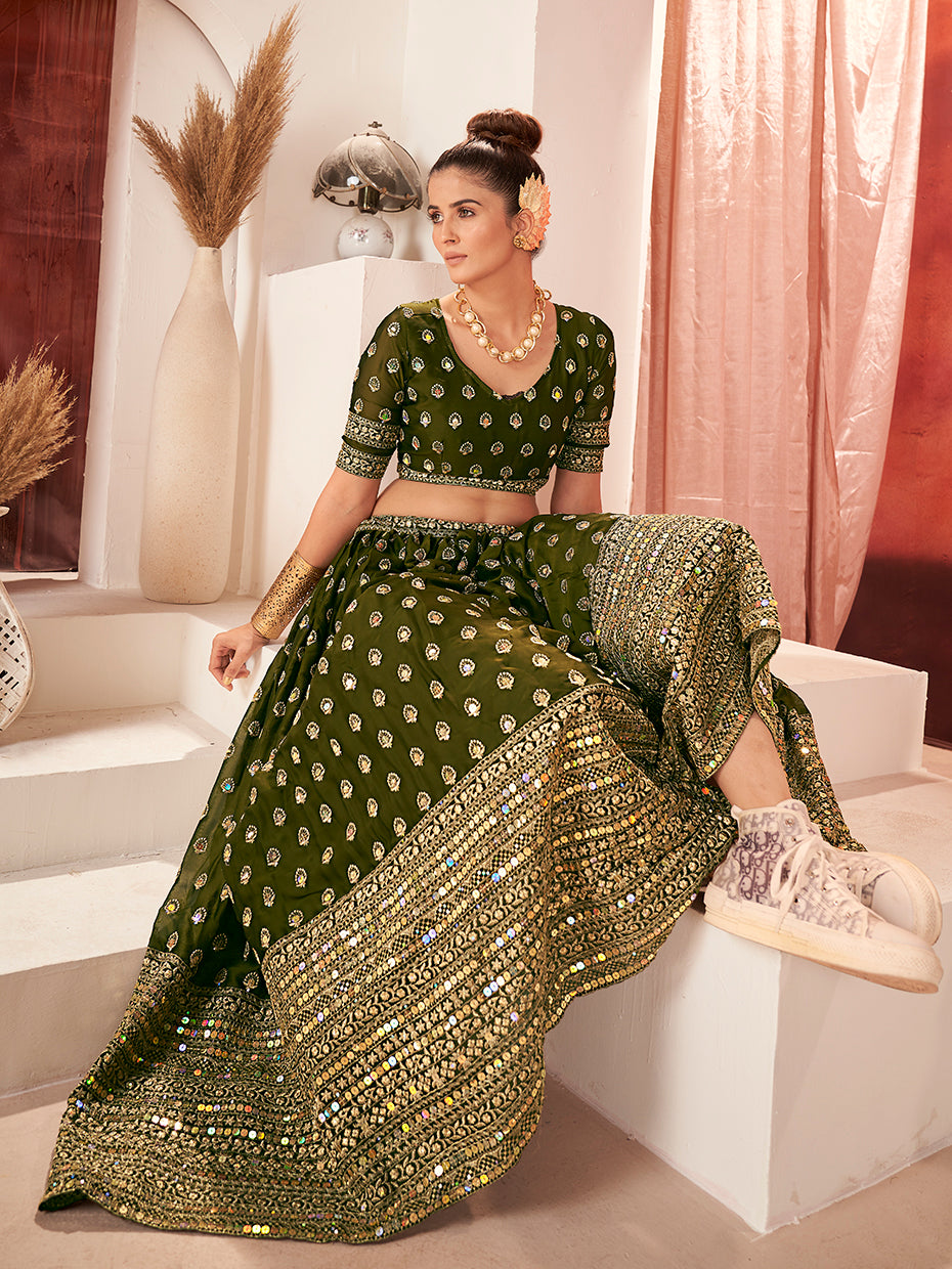 Olive Green Gold Embroidered Mehendi Special Silk Lehenga Choli